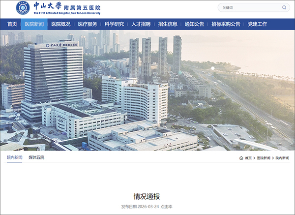 广东珠海中山大学附属第五医院网站3月24日发布情况通报。
