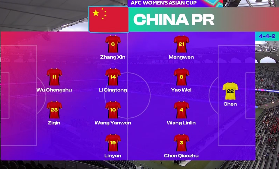 在首发阵容的选择上,中国女足442阵型出击,邵子钦、吴澄舒搭档锋线,中场位置上从左到右分别为张琳艳、王妍雯、李晴瞳以及张馨,陈巧珠、汪琳琳、姚伟以及李梦雯组成后卫线,守门员陈晨。上轮比赛中国女足2-0赢了孟加拉国,前2轮比赛中国女足只有陈晨以及汪琳琳连场首发。