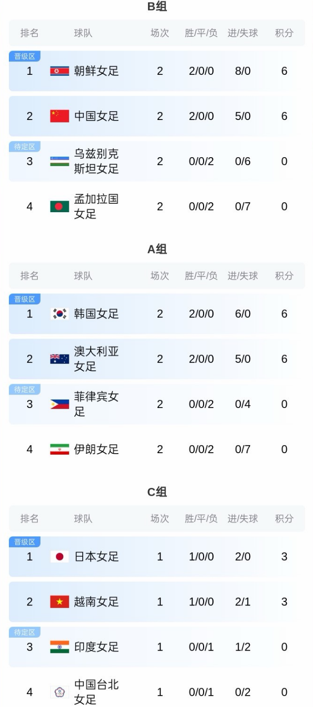 朝鲜女足本轮以5-0大胜孟加拉国,目前朝鲜队跟中国女足在B组中同为6分,乌兹别克斯坦、孟加拉国0分排名第3、4位。A组的韩国队以及澳大利亚队2连胜,同积6分,菲律宾、伊朗队0分排名第3、4位。C组还有两轮未赛,日本、越南同为3分,排名前2名,印度、中国台北队均为0分,排名第3、4位。