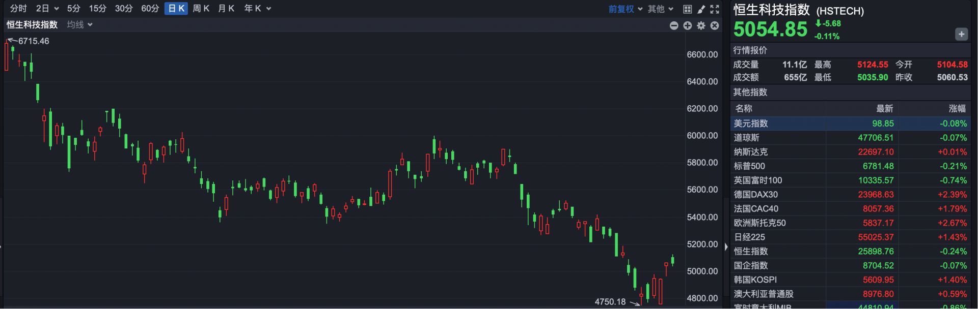 恒生科技指数收盘报5054.85点,下跌5.68点,跌幅0.11%。