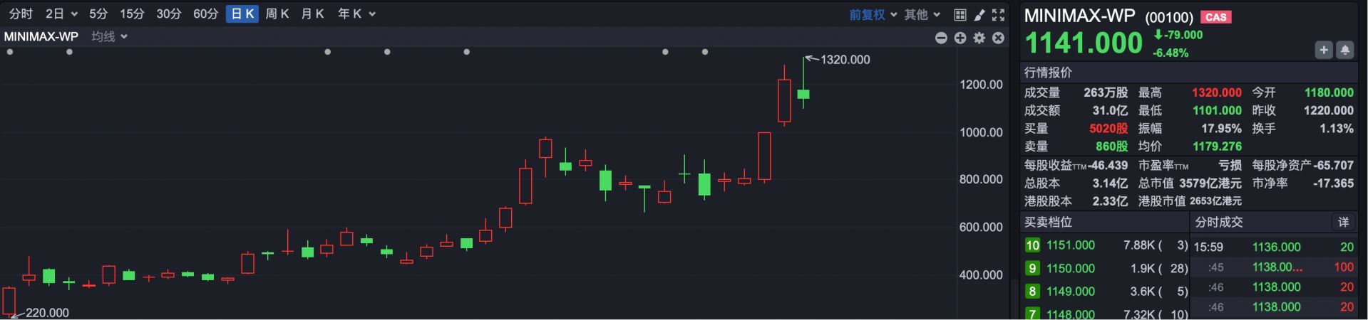 市场方面,大红大紫的“养龙虾”概念股今日明显降温。重要公司中,腾讯控股(00700)高开超4%,最终小跌0.27%。其他个股中,迅策(03317)跌超8%,智谱(02513)跌超6%,Minimax(00100)跌超6%,但盘中创出1320港元历史新高,最终报收于1141港元。
