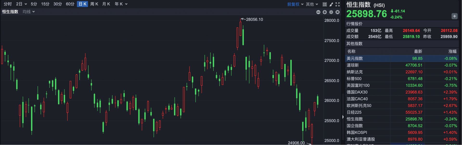 截至收盘,恒生指数报25898.76点,下跌61.14点,跌幅0.24%。