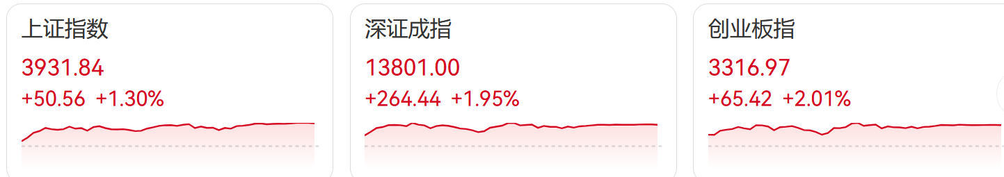 25日,A股三大指数集体走强:截止收盘,沪指涨1.30%,收报3931.84点;深证成指涨1.95%,收报13801.00点;创业板指涨2.01%网络配资网站,收报3316.97点。沪深京三市成交额2.19万亿,较昨日放量968亿。